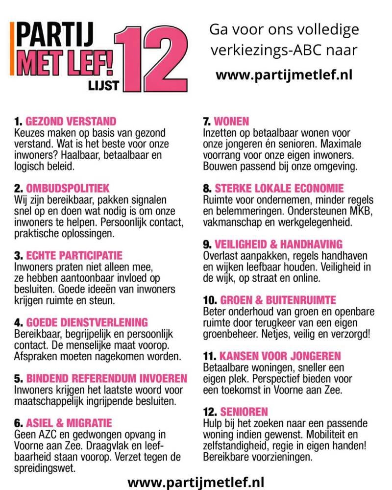 Jij bent onze drijfveer!Wij bewegen mee waar het kan, maar houden onze rug recht als het moet!De inwoners van Voorne aan Zee staan bij Partij met Lef! op één en kunnen op ons rekenen.Kunnen wij ook op jullie rekenen?